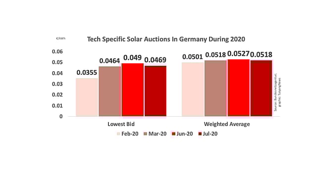 The lowest and highest winning bids of €0.0469 and €0.0536 ($0.056 to €0.064) per kWh dropped lower than €0.049 to €0.054 per kWh received last time for the March 1, 2020 technology specific tender. The average weighted winning bid of €0.0518 ($0.062) per kWh also dropped lower than last round's €0.0527 per kWh (see Over 99 MW PV Awarded In German Tender). For this tender, bids were capped at €0.075 ($0.089) per kWh.