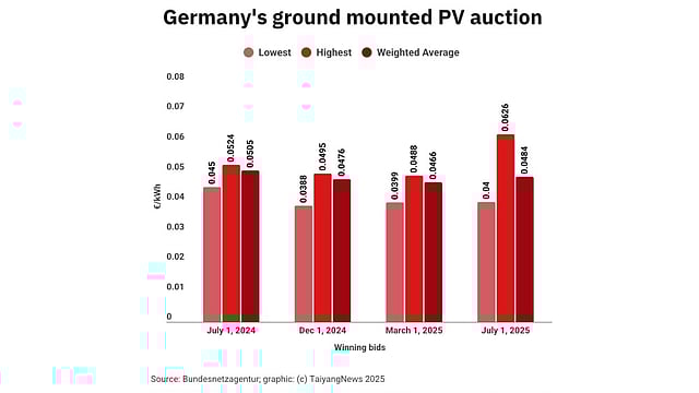 Germany’s July 1, 2025, tender for ground-mounted solar PV capacity was another oversubscribed one for this segment. Prices were rather stable and competitive, even as they were slightly above the previous round.