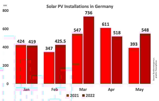 In the month of May 2022, Germany saw registrations for solar energy systems adding up to a total of 548.13 MW, according to the country's Federal Network Agency or Bundesnetzagentur.