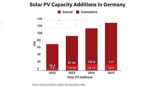 Germany installed 16.4 GW of new solar PV capacity in 2025, marginally lower than the 16.73 GW added in 2024, according to the Federal Network Agency