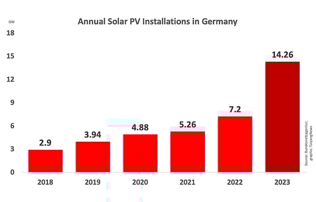 After 9 consecutive months of installing over 1 GW of solar PV capacity, German installations slowed down to 880 MW in the month of December 2023, as per current deployment data from Bundesnetzagentur. Yet, its total of 14.26 GW is its highest annual capacity ever and twice the level installed in 2022, beating the 9 GW 2023 target of the government significantly.