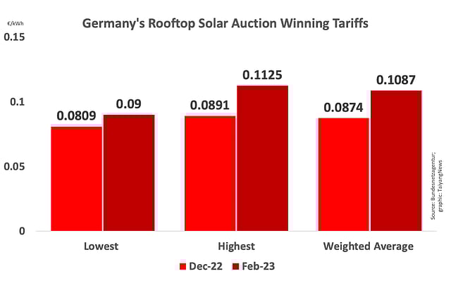 In the previous round held on December 1, 2022 weighted average was €0.0874/kWh, and the lowest and highest ranged within €0.0809/kWh and €0.0891/kWh (see Another Undersubscribed Rooftop Solar Auction In Germany).