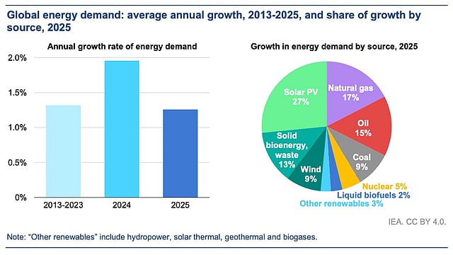 As solar PV electricity generation rose, demand for oil, gas, and coal was subdued. While demand for the latter still increased in 2025, the growth was slower than in 2024. It was the low-emission sources – including solar, wind, nuclear, and hydropower – that made up nearly 60% of the total demand growth.