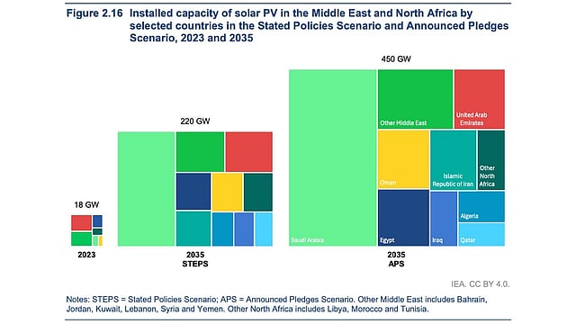 The solar PV capacity in the MENA region could rise from 18 GW in 2023 to 220–450 GW by 2035, as per the IEA