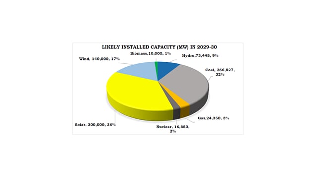 By the end of 2029-30, India may see wind and solar power accounting for 440 GW of total installed power capacity of India which is estimated to grow to 831 GW by then. Solar is expected to have 300 GW capacity installed, adding 36.1% to the total energy mix, which higher than for any other technology. However, coal would continue to be the leader in terms of gross generation accounting for 50% of total power generation.