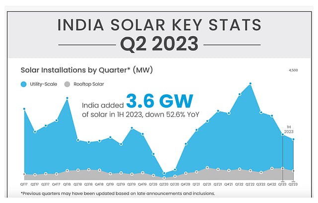 Delays, extensions and postponements pulled down Indian solar PV installations by 53% annually to 3.6 GW in calendar year (CY) H1/2023, taking the cumulative capacity of this clean energy generation source in the country to exceed 66 GW at the end of June 2023, according to Mercom India Research.