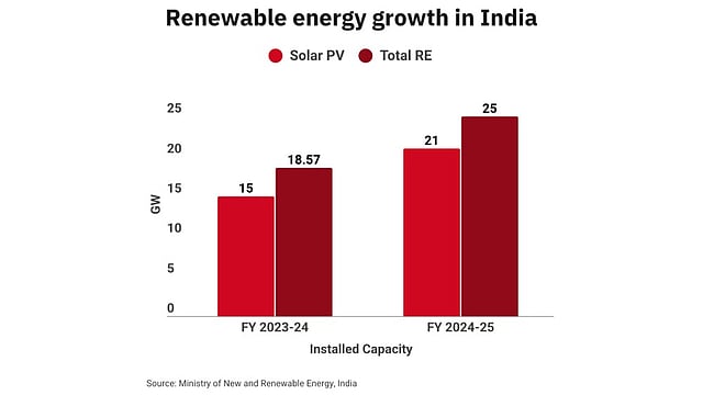 India installed 25 GW of new renewable energy capacity in FY 2024-25, a record for the country as it represents nearly 35% of annual increase over previous year’s 18.57 GW, according to the Ministry of New and Renewable Energy (MNRE).