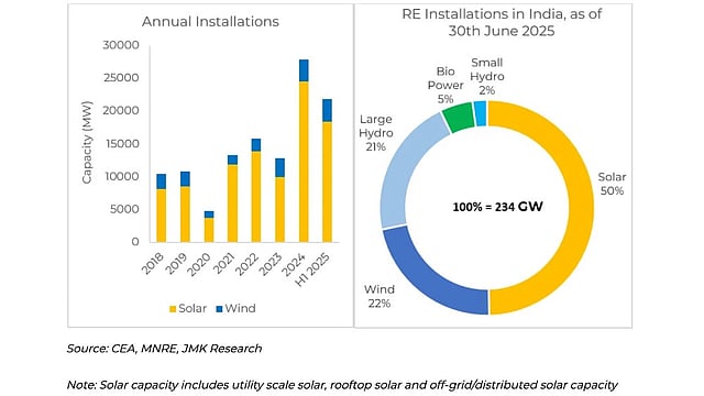 India’s solar momentum remains strong with 18.3 GW of new PV capacity added in H1 2025, marking a 51.6% year-on-year (YoY) growth, according to JMK Research & Analytics.