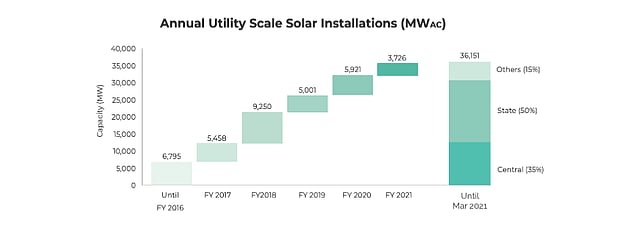 India installed 6.2 GW solar capacity in FY2021: JMK Research and Analytics said in FY2021 (period ending March 2021), India installed about 3.7 GW of utility scale and 2.5 GW of rooftop solar power capacity. It adds up to about 36 GW of utility scale solar capacity in the country, with another 45 GW in the pipeline. For FY2022, it sees the country commissioning another 10 GW of utility scale solar and 3.2 GW of rooftop or onsite solar capacity. During FY2021, maximum solar modules were shipped into the country by LONGi, JinkoSolar from China, and also from Adani in India. A growing number of modules, 52% came in as monocrystalline modules, showing the preference for this technology.