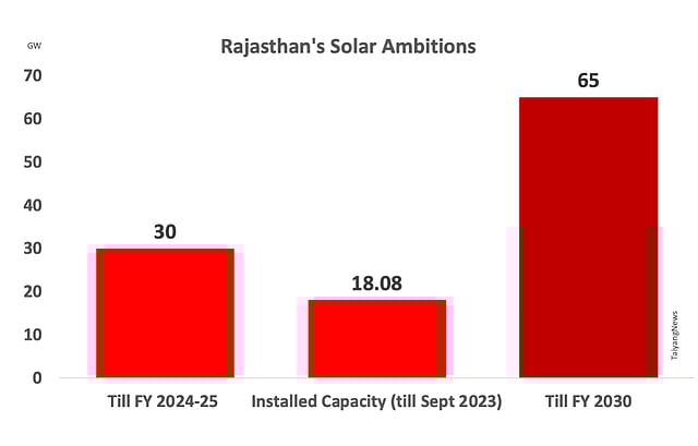 Solar energy forms the lion's share of Rajasthan's renewable energy targets for 2030 under the state government's newly released Rajasthan Renewable Energy Policy, 2023. Rajasthan's 65 GW solar target will make up over 23% of the 280 GW solar target set by the Government of India (GoI) for the target year.