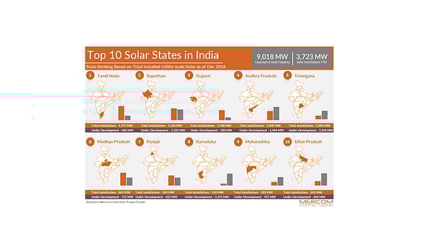 Top 10 states account for around 90% of all solar installations and pipeline in India. According to Mercom, along with the above mentioned states, Madhya Pradesh, Punjab, Karnataka, Maharashtra and Uttar Pradesh have been the key stakeholders in India's solar boom