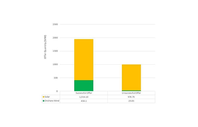 The average weighted bid price discovered in this auction is €97.87 per MWh for all winning projects, while for community projects the same was determined as €116.41 per MWh. In comparison, under RESS 1 solar secured a weighted average bid price of €72.92 per MWh winning almost 600 MW capacity with solar appearing as a standalone preference category (see Solar Appears To Be Winning Over Wind In Irish Auction).