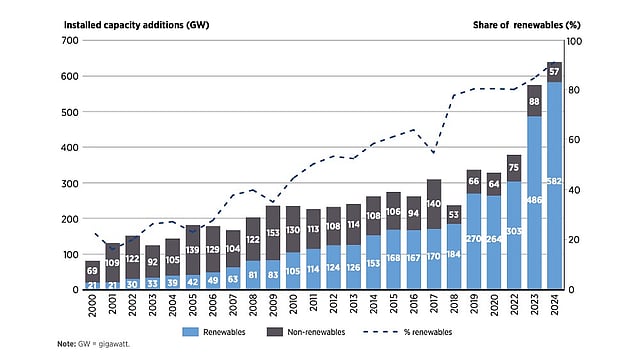 It adds, “Achieving the target by 2030 would have required maintaining a minimum annual growth rate of 16.1% from 2022 onwards. However, since 2023 and 2024 both fell short of this rate, renewable capacity must now expand even faster (by 16.6% each year during the remaining six years of the decade).”