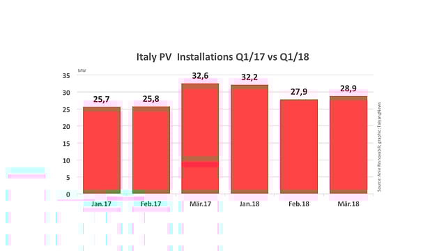 In January 2018, the new installations amounted to 32.2 MW, and in February 27.9 MW. In the month of March 2018, newly added capacity was 28.9 MW, decreasing from 32.6 MW added in March 2017. Italian Renewable Energy Association Anie Rinnovabili has put forward these numbers based on data assembled from Terna, the country's grid operator.