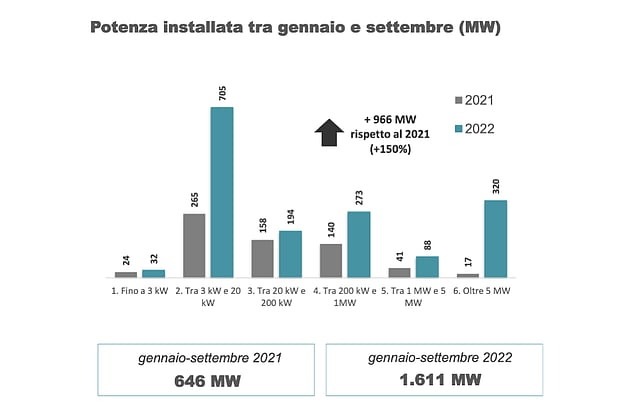 Titled InFotovoltaico, the report says 1.6 GW was an annual improvement of 966 MW or 150% over 646 MW the country reported for 9M/2021 with the addition of 69,096 new systems installed. Most of this capacity came from systems in the range of 3 kW to 20 kW.