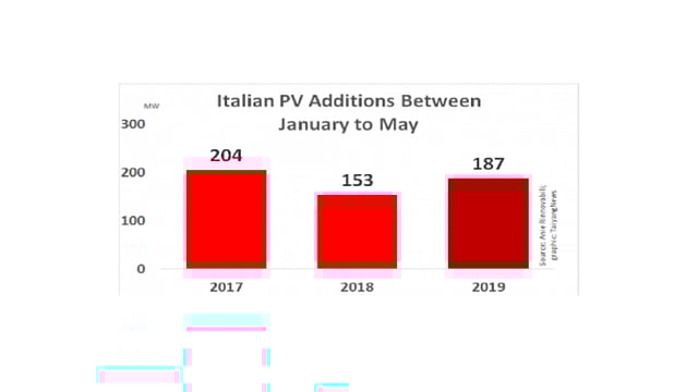 Italy added 187 MW of solar power capacity in the first 5 months of 2019, according to Italian renewable energy association Anie Rinnovabili. This is an increase of 22% over the same period in 2018, it said. In Q1/2019, the country installed 105 MW in total (see 105 MW New Solar For Italy In Q1/2019).