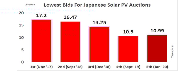 Japan's first solar auction in November 2017 attracted a lowest bid of JPY 17.2 ($0.16) per kWh which was way above what was determined in solar auctions across the world back then, and awarded 141.366 MW to the winners. The minimum project capacity under first, second and third auctions was 2 MW and was reduced to 500 kW from fourth auction round.