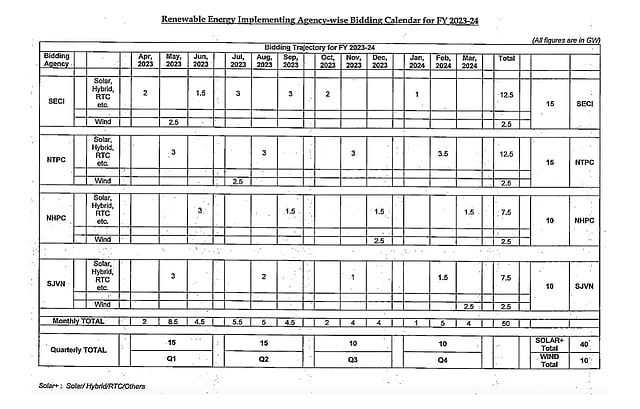 The Ministry of New and Renewable Energy (MNRE) has released India's renewable energy bidding calendar for FY 2023-24 with 40 GW solar and 10 GW wind capacity to be issued by various renewable energy implementing agencies (REIA). It includes hybrid round-the-clock projects among others.