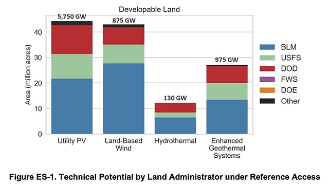 For wind energy, the technical potential on federal lands is lower at 875 GW, but it can be installed on 43 million acres. For enhanced geothermal systems (EGS), it estimates a technical potential for 975 GW to be installed on 27 million acres and 130 GW of hydrothermal potential on 12 million acres.