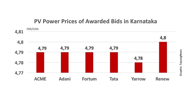 India's National Thermal Power Corporation (NTPC) recently announced that six companies have won the auction for its 500 MW Pavagada Solar Park in Karnataka. Four companies won 100 MW each for a tariff of 4.79 INR per kWh (7.20 US ct), the remaining capacity was awarded at 50 MW each for a tariff of 4.78 INR per kWh and 4.80 INR per kWh.
