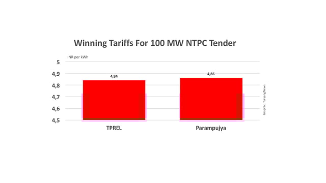 The National Thermal Power Corporation (NTPC) of India has announced winners of the 100 MW solar power capacity it had tendered in June 2016 (see NTPC 100 MW Tender In Karnataka). Tata Power Renewable Energy Limited (TPREL) and Parampujya Solar Energy Private Limited have each won 50 MW capacity.