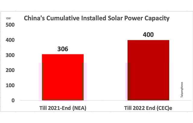 China Electricity Council (CEC), a local industry association in China, expects the country's cumulative grid connected solar power capacity at the end of 2022 to reach 400 GW, which would be an increase from 306 GW it reached by 2021-end, meaning the Asian giant could be looking at over 90 GW of annual additions this year.
