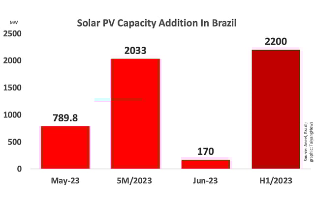 In the month of June 2023, Brazil added 538.1 MW capacity of which 239.4 MW was in Rio Grande do Norte. Previously, between January 2023 to May 2023 Aneel said the country added 2.033 GW of solar PV capacity, meaning in June Brazil added around 170 MW new PV which is way less than 789.8 MW it reported for this power source in May 2023 (see Brazilian Solar Installations Growing).