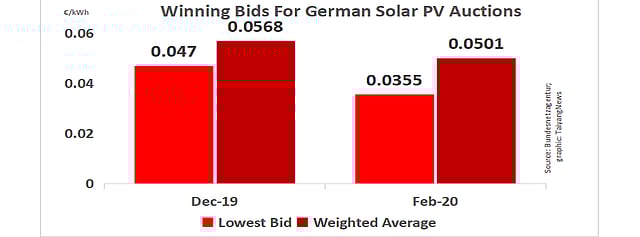 Winning bids ranged between a new record low €0.0355 ($0.038) per kWh and €0.0521 ($0.056) per kWh as the highest bids considered, compared to last auction's winning range of €0.0470 per kWh to €0.0620 per kWh. Weighted average winning bid was determined as €0.0501 ($0.054) per kWh which is lower than €0.0568 per kWh achieved in the previous PV tender in December 2019 whose results were announced in January (see Germany Awards 501 MW Under 5th PV Auction Of 2019).