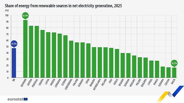 Renewable energy accounted for 47.3% of the EU’s electricity generation in 2025, slightly up from 47.2% in 2024, according to Eurostat