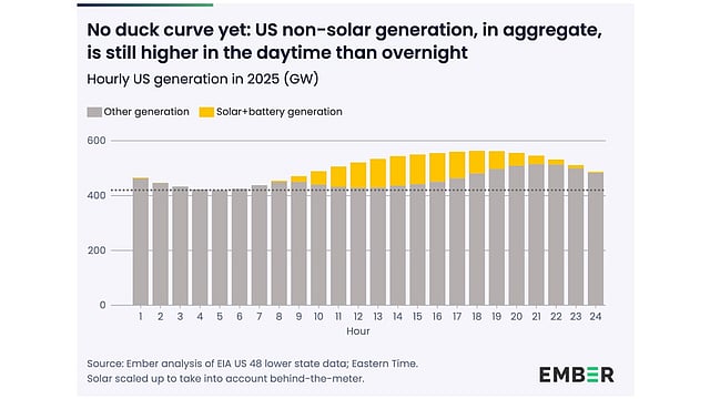 Ember points out that the US has yet to see a ‘duck curve’ problem, which means that non-solar power demand is higher during the day than at night, so solar has not yet caused major oversupply during daylight hours. Even at the sunniest hour, solar provided only 20% of US electricity generation on average across the year, the report reads.