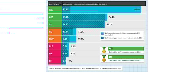 In its latest report titled State of Play: Renewable Energy Leaders and Losers, Climate Council identified the Australian Capital Territory (ACT) to achieve its 100% renewable energy target on January 1, 2020, followed by Tasmania as it pursues battery storage facilities.
