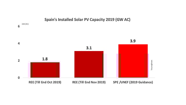 When compared with the statistics till end of October 2019, only 1.8 GW of solar had been installed. This clearly means, within November 2019 Spain added 1.3 GW (AC) new PV capacity.