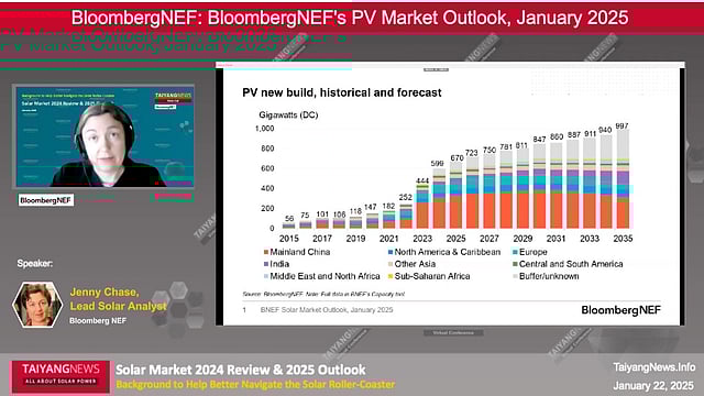 Lead Solar Analyst at Bloomberg New Energy Finance (BloombergNEF) Jenny Chase launched her presentation announcing 599 GW DC of new PV installations in 2024 while adding that more and more countries are now coming out with their annual installation figures. Of this, 335 GW DC was installed in China, although the officially released number of 277 GW was in AC (see China Exited 2024 With Over 277 GW New Installed Solar PV Capacity).