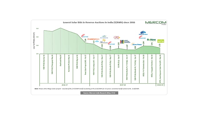 The lowest winning tariff was 2.72 INR ($0.0403) per kWh and was offered by Sprng Energy, which is backed by London based private equity fund manager Actis. The other two winners are UK development finance institution CDC Group plc backed Ayana Renewable Power and SoftBank promoted SBG Cleantech. Both the companies won 250 MW capacity each for 2.73 INR ($0.0405) per kWh, according to Mercom India Research.