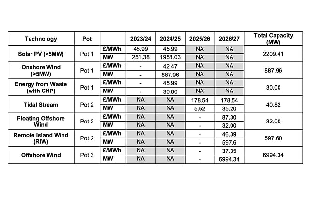 Offshore wind secured the maximum with almost 7 GW, followed by onshore wind with 900 MW, 41 MW tidal stream and 32 MW floating offshore wind.