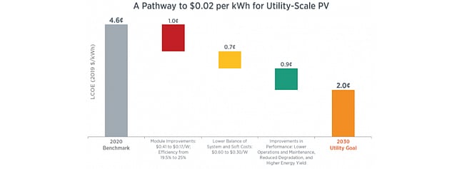 This translates into achieving a $0.02 per kWh cost target for utility scale solar by 2030, while reaching an interim of $0.03 per kWh by 2025, down from $0.046 per kWh at present. This would accelerate the 2030 cost target by 5 years. Previously DOE reached the 2020 target of $0.06 per kWh in 2017 (see SunShot Initiative Achieves 6 ct/kWh Goal).