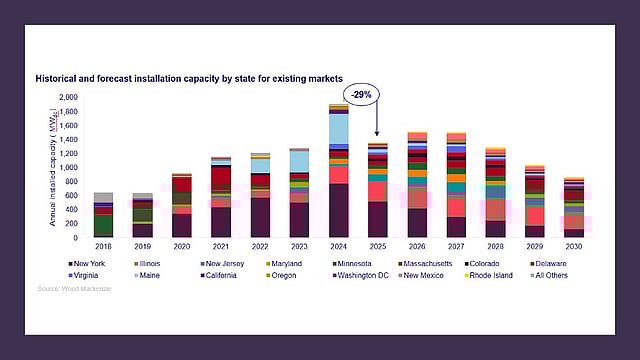 Analysts forecast this market segment to contract by 29% in 2025. Through 2030, the national installed community solar capacity is projected to contract by an average of 12% annually, shared Connelly.