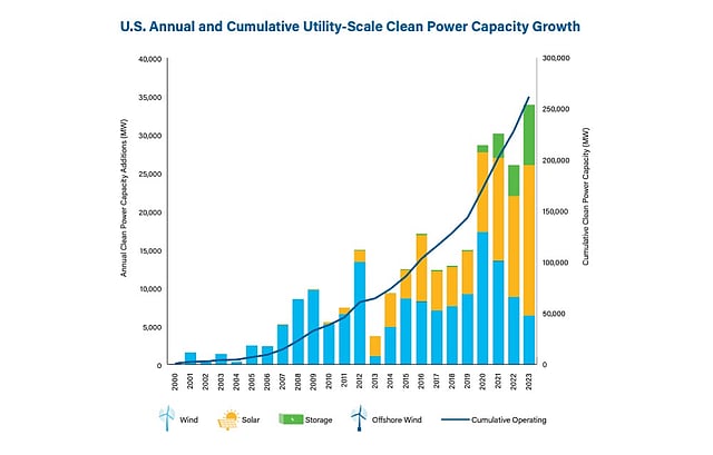 Falling costs for solar modules with market oversupply and easing supply chains for this technology led new utility-scale clean power installations in the US in 2023 as the market grew by 30% annually. The 33.8 GW new installations of solar, wind and energy storage were an increase of 7.9 GW taking the total operational capacity to 262 GW at the end of last year, says the American Clean Power Association (ACP).