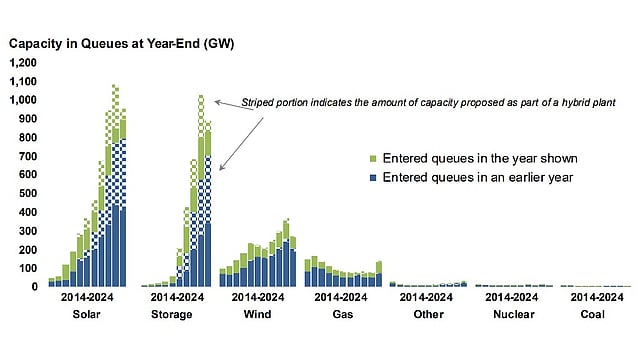 Berkeley Lab reports that 161 GW of new solar capacity entered the queue in 2024, though CAISO and PJM paused new applications. Going by historical trends, only about 9% of queued solar projects will ultimately get built.
