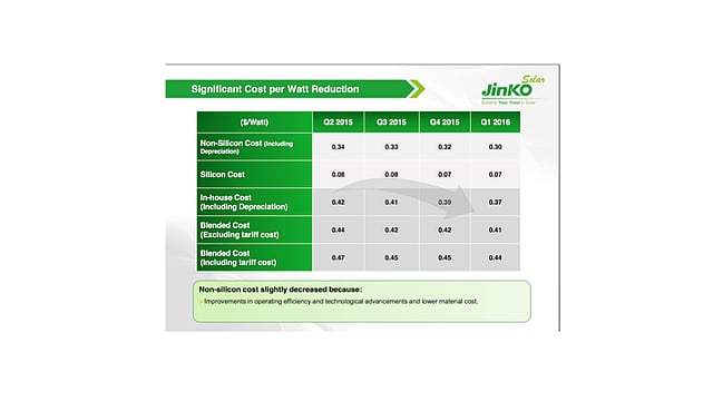 While many reports primarily emphasised that Jinko Solar shipped more modules than market leader Trina Solar in Q1/2016 (TaiyangNews did as well – see Jinko Solar Q1/2016), my top slide of Jinko's presentation was the one on module production cost. Jinko produced in-house modules at 37 US cents per W, that's 5 cents or 12% lower than 1 year ago, and even 2 cents less than in the previous quarter. That's simply amazing!