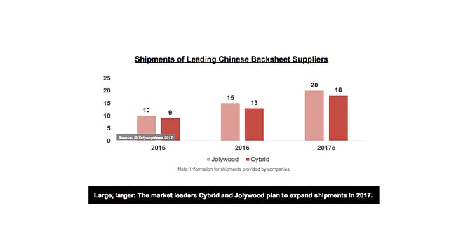We have also seen a segment dominated by western players turning into a field strongly dominated by companies from China. Jolywood and Cybrid have shipped together about 28 GW in 2016 and plan to expand sales to around 38 GW in 2017, which would be around half of global solar demand this year.