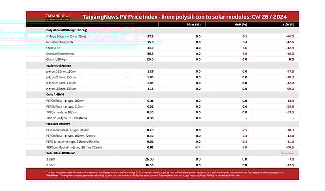 TaiyangNews PV Price Index – from polysilicon to solar modules:2024 CW 26 |