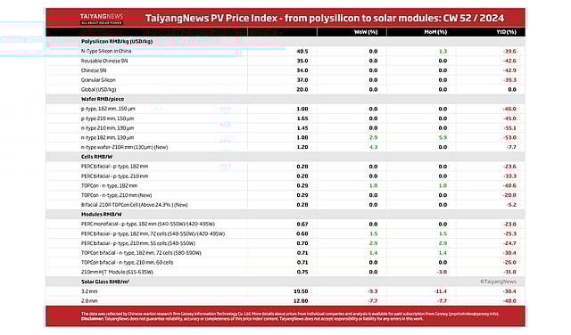 The TaiyangNews PV Price Index saw some positive price movements in Calendar Week 52 in the wafer, cell, and module categories while solar glass prices experienced high-single-digit drops