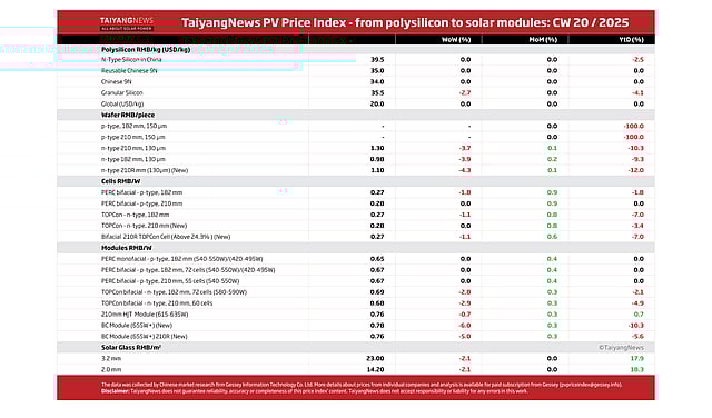 Prices for the 2 TOPCon module declined 2.8% (182 mm) and 2.9% (210 mm) in CW20, while the BC module types were down 6.0% (655W+) and 5.0% (655W+ 210R) WoW.