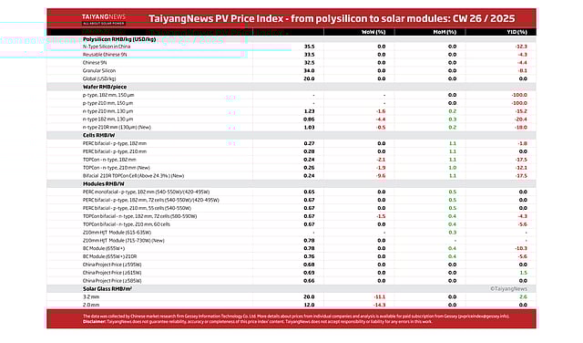 Calendar Week 26 brought a broadly negative turn for the TaiyangNews PV Price Index, with declines across multiple product categories.