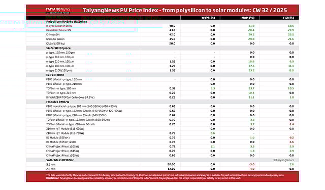 After 3 consecutive weeks of gains, the TaiyangNews PV Price Index saw limited movement in CW32. Year-to-date, polysilicon prices are up at least 18.5%. N-type wafers, cells, and modules continue to reduce earlier losses, while p-type products remain absent from listings.
