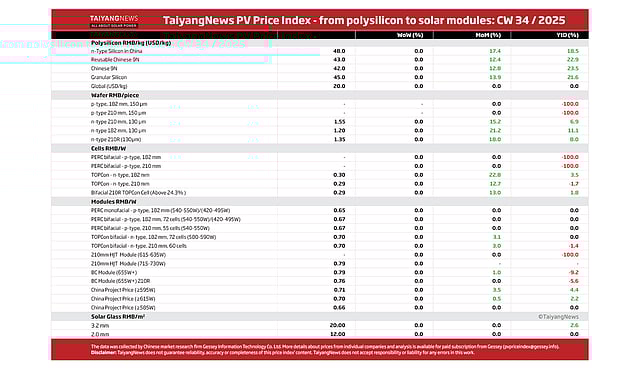 All products in the TaiyangNews PV Price Index held flat WoW in CW34. Excluding discontinued PERC products, all but 4 tracked products are flat to up year-to-date (YtD). Polysilicon has recorded the strongest gains, ranging from 18.5% to 23.5% YtD.
