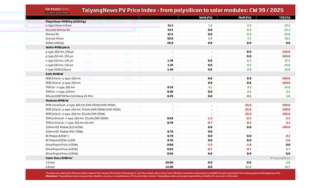 Calendar Week 39, like CW38, was mixed for the TaiyangNews PV Price Index, with a few upstream gains offset by module declines.