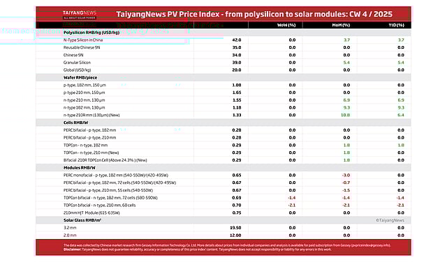 While the first 3 weeks of CY2025 were largely positive for the TaiyangNews PV Price Index, CW4 saw WoW price declines for 2 TOPCon module types. In general, products upstream have seen some upward movement while the downstream has been more or less stagnant.