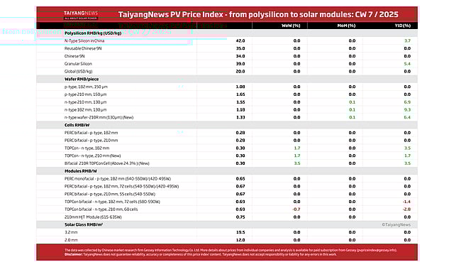 Calendar Week 7 for the TaiyangNews PV Price Index saw 3 positive changes in cell prices and 1 negative in modules.